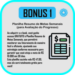 O segredo do sucesso está na melhoria contínua. O e-book traz um método simples para acompanhar seu desempenho, ajustar estratégias e garantir que seu faturamento evolua mês a mês, chegando (ou até superando!) os R$ 10.000 em 30 dias.